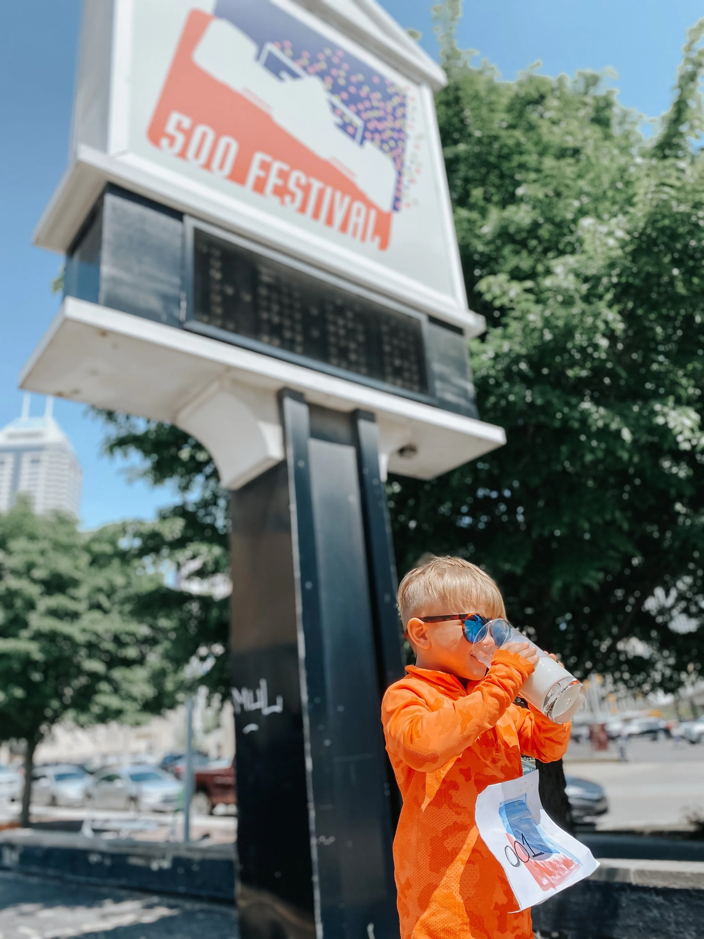 A young boy drinks milk (a tradition held by the winner of the Indy 500) in front of the 500 Festival sign.